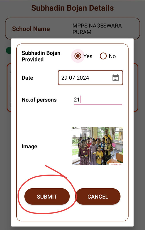 PM Poshan >> HM Services >> Subhdin Bhojan Details >> Check Yes Option, Select Date 29.7.2024, No.of Children Provided, Choose image from Gallery of Capture image with Camera >> Click on Submit